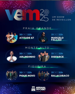 A programação que foi divulgada pela imprensa umas semanas atrás, por meio de fontes seguras, foi confirmada pela Prefeitura de Arraial do Cabo, que intensificou hoje (26), a programação. O público vai poder contar com shows de Marcelo Falcão, ex-vocalista do Rappa; o grupo de pagode Atitude 67, que estourou com a música ‘Cerveja de Garrafa’; Pique Novo com seu hit ‘Diz pra mim’; Balacobaco na festa, com sua música ‘É dia de festa’; Grupo Disfarce com ‘Sintonias de Amor’ e Arlindinho, filho do consagrado Arlindo Cruz, com muito samba. Também está programado show pirotécnico para as boas-vindas de 2025.